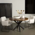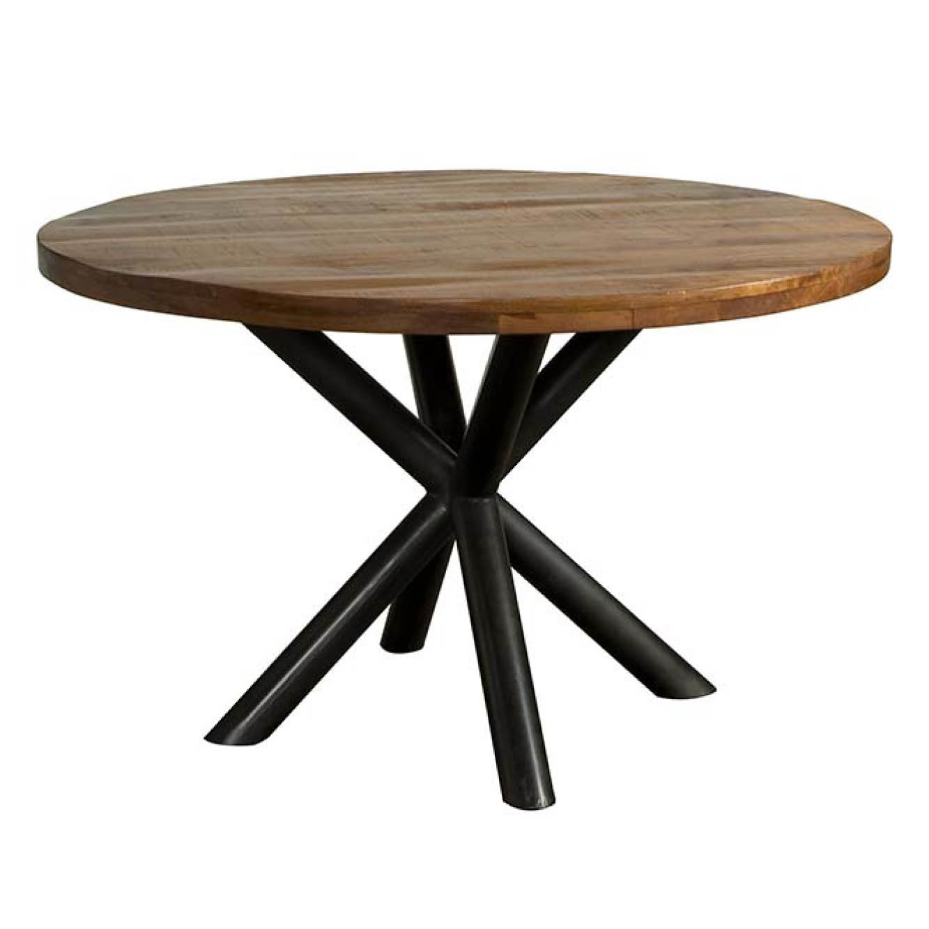 Ronde eettafel mangohout met zwarte, ronde spinpoot.
