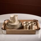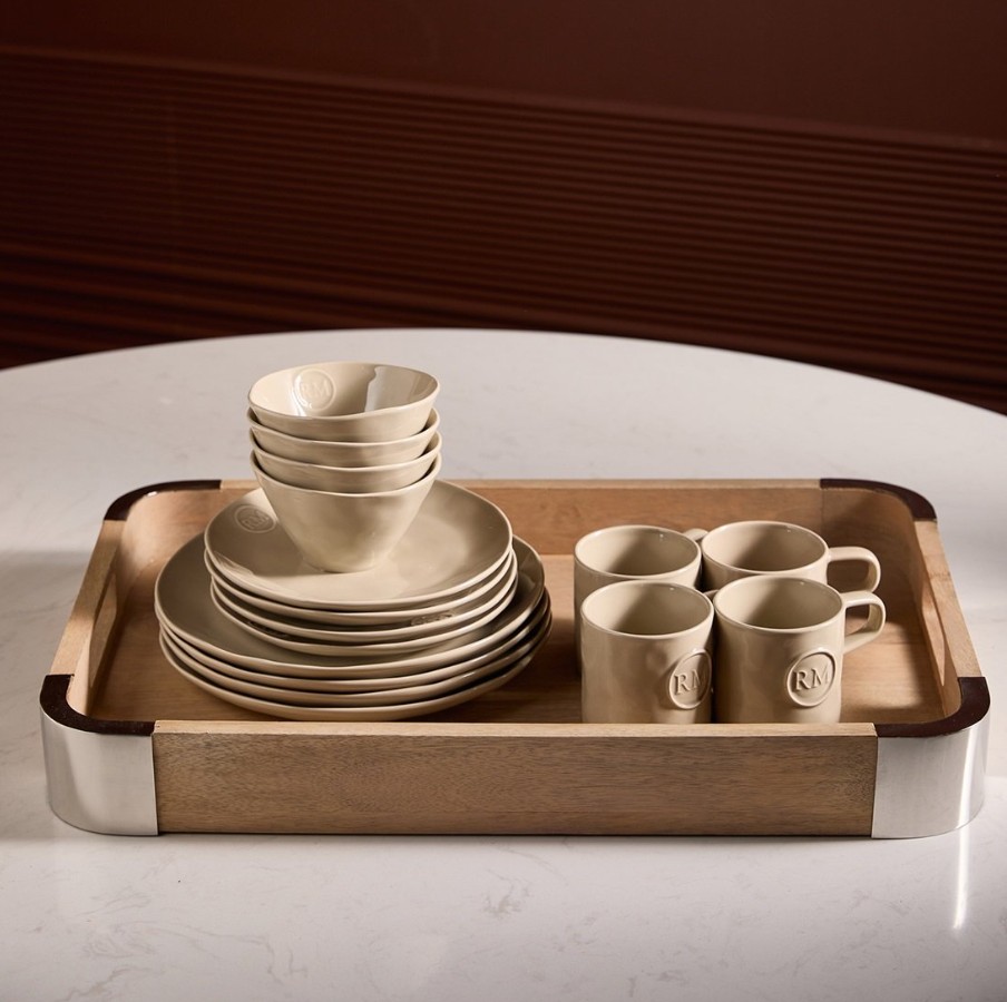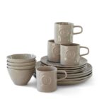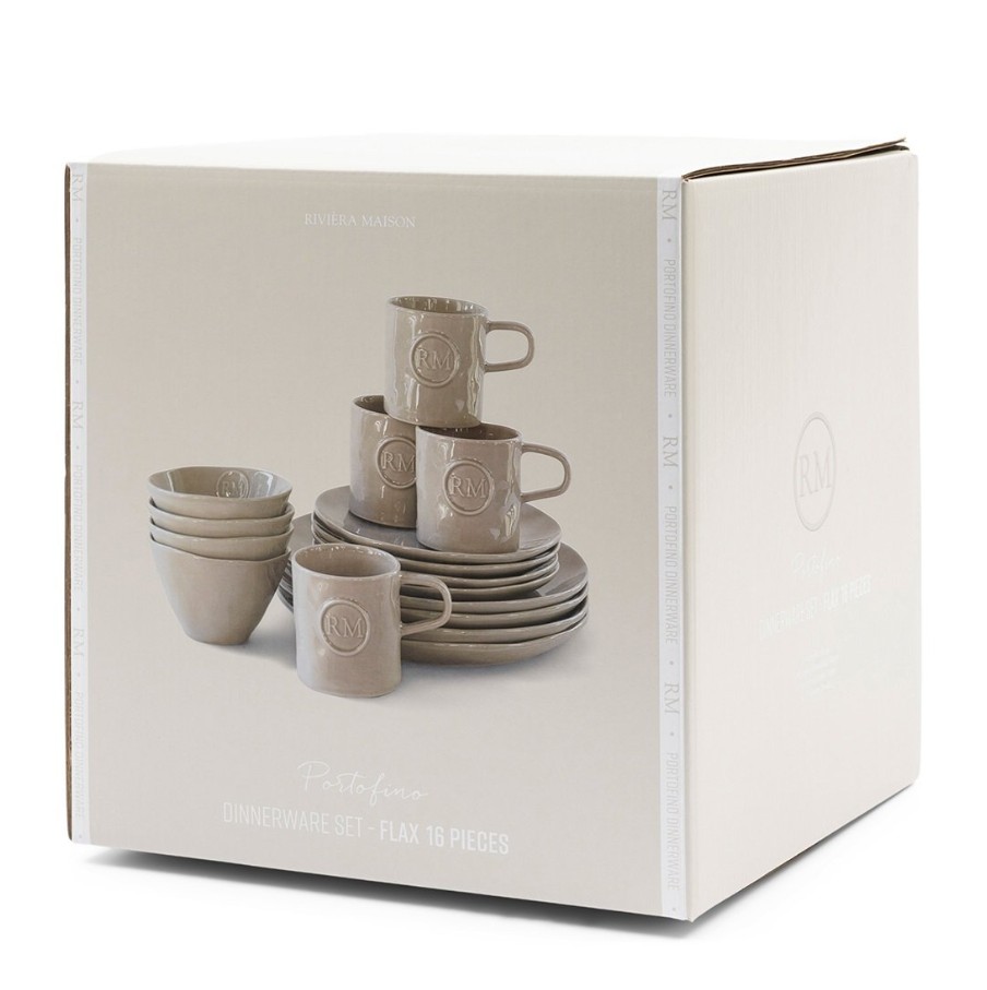 Complete serviesset van 16 delen in taupe kleur, inclusief 4 mokken, 4 borden en 4 kommen met het “RM”-logo. Deze luxe set is ideaal voor koffie, thee, ontbijt of diner en voegt een moderne en elegante uitstraling toe aan je tafel. Perfect als cadeau voor liefhebbers van stijlvol servies en kwaliteit.